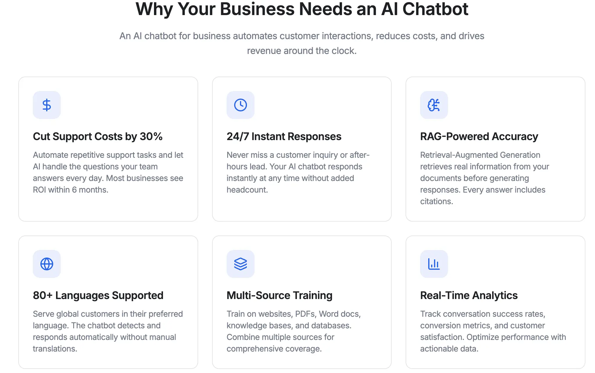 Build and deploy AI chatbots with no coding required. Provide instant answers to customer questions, capture leads, and empower your team with intelligent knowledge discovery.