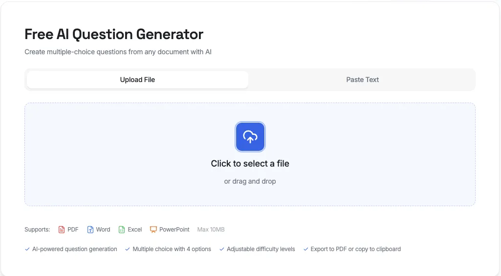 No account creation, no credit card, no hassle. Just instant quiz questions from any document.