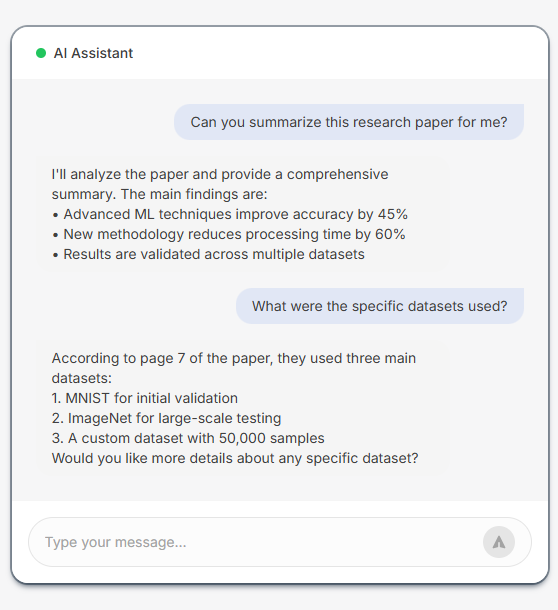 Rather than searching through folders or scanning long files manually, you can upload documents in formats like PDF, Word, Excel, and PowerPoint.