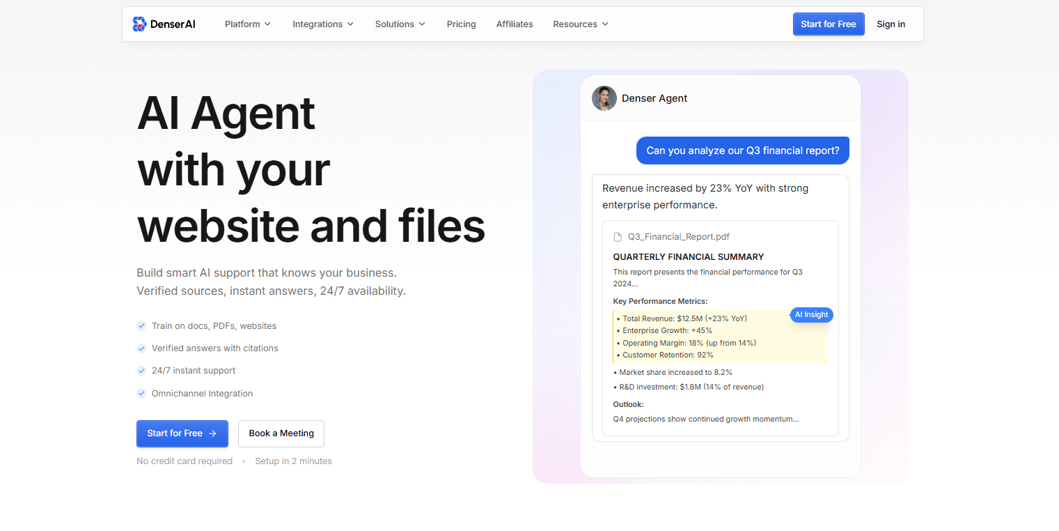 It also supports complex document review as Denser can parse through lengthy PDFs or support docs and give summarized answers. This is invaluable for technical support and resource center use cases.